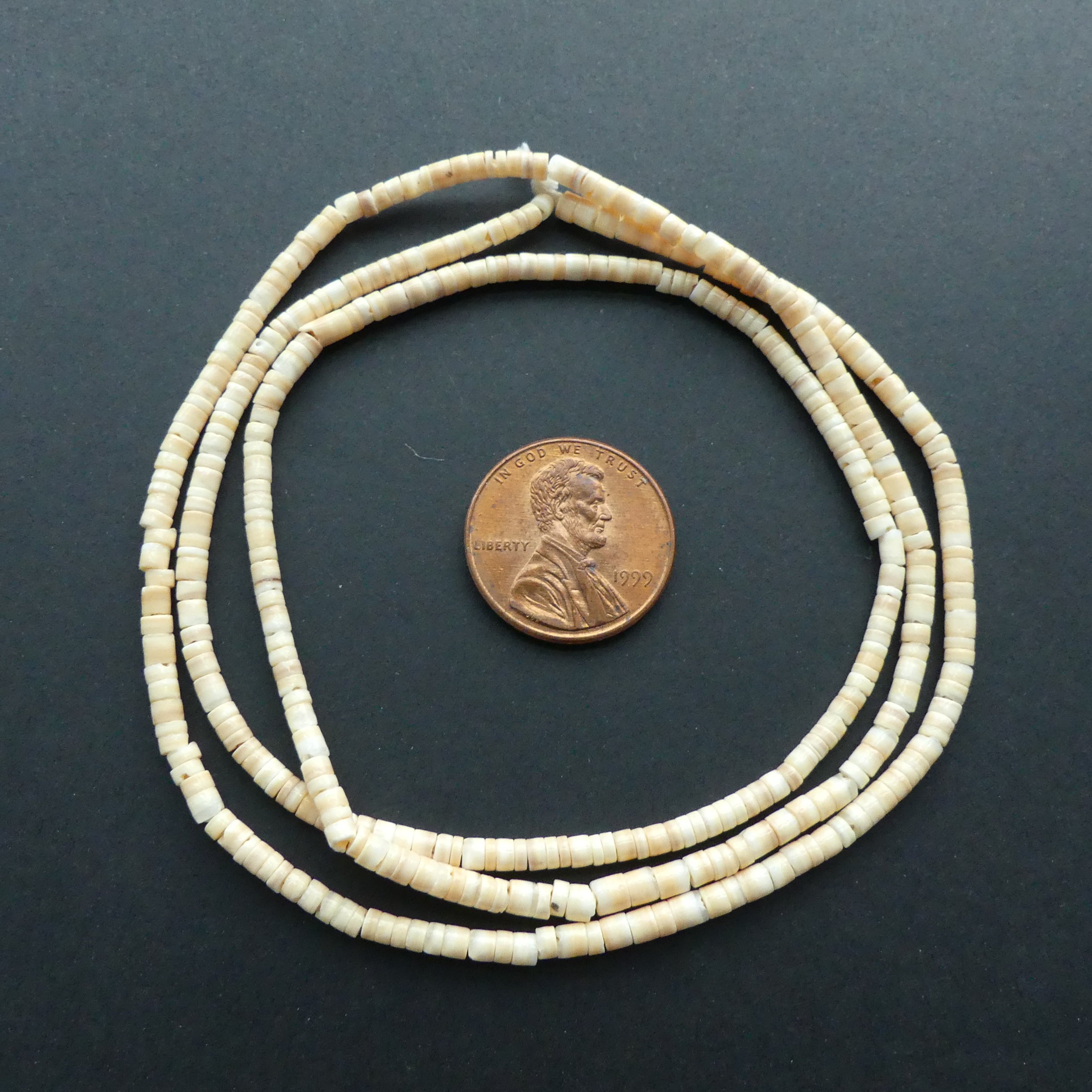 - Luana shell heishi 3mm diameter on 24-inch strands
