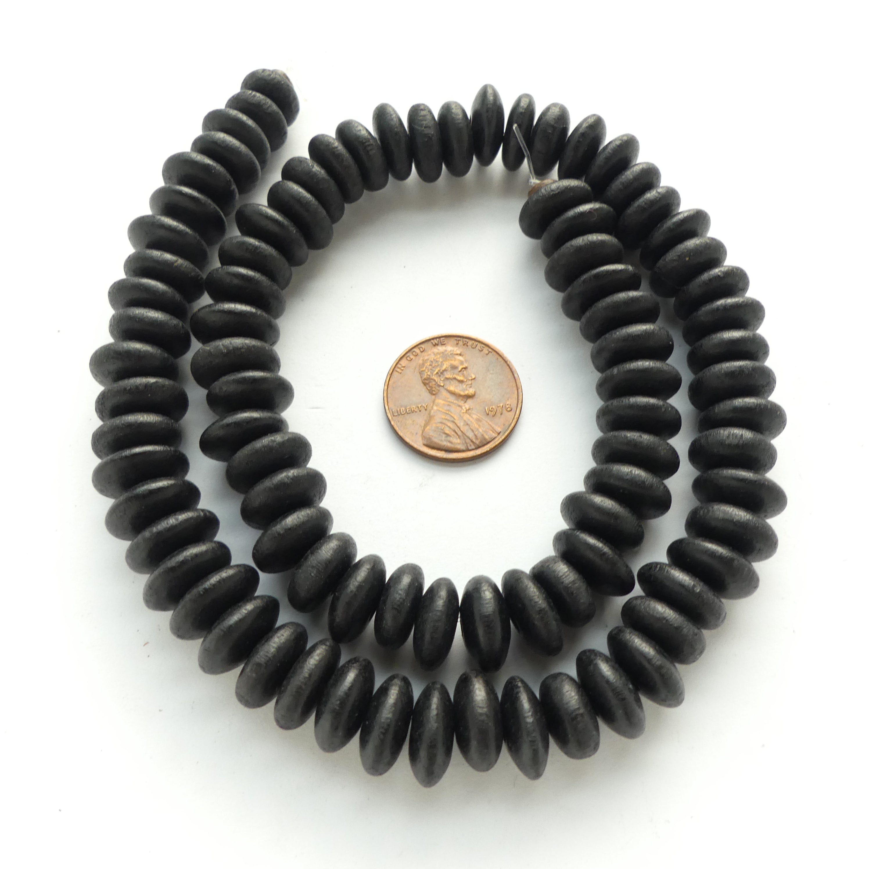 - Black wood rondelles, dyed, 5x12mm on 16-inch strands