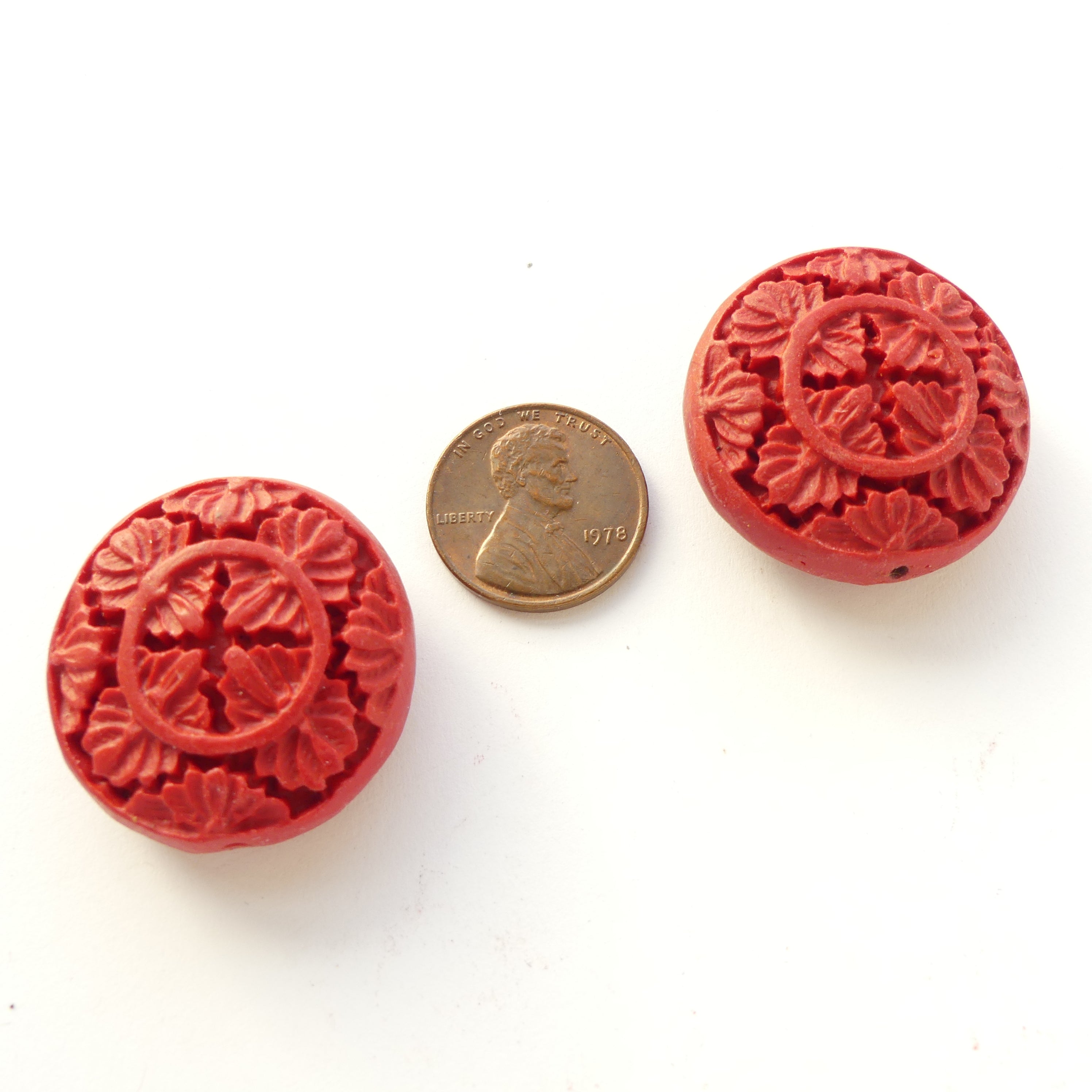 - New Cinnabar, coin shapes 30mm diameter with detailed floral designs