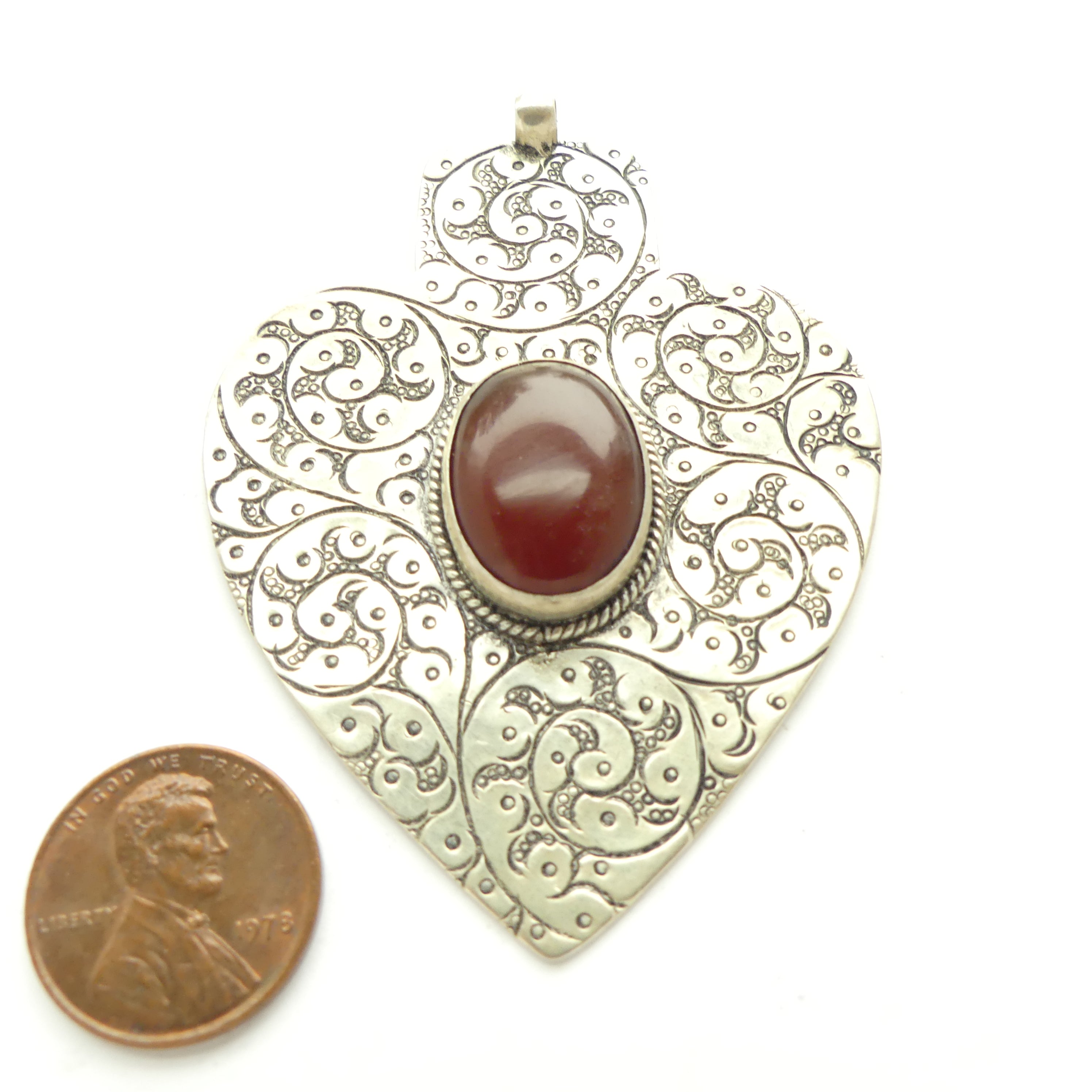 - Traditional Turkoman heart-shaped pendant, decorated with spiral, paisley floral designs in Turkey. Silver with oval carnelian cabochon 2x3 inches