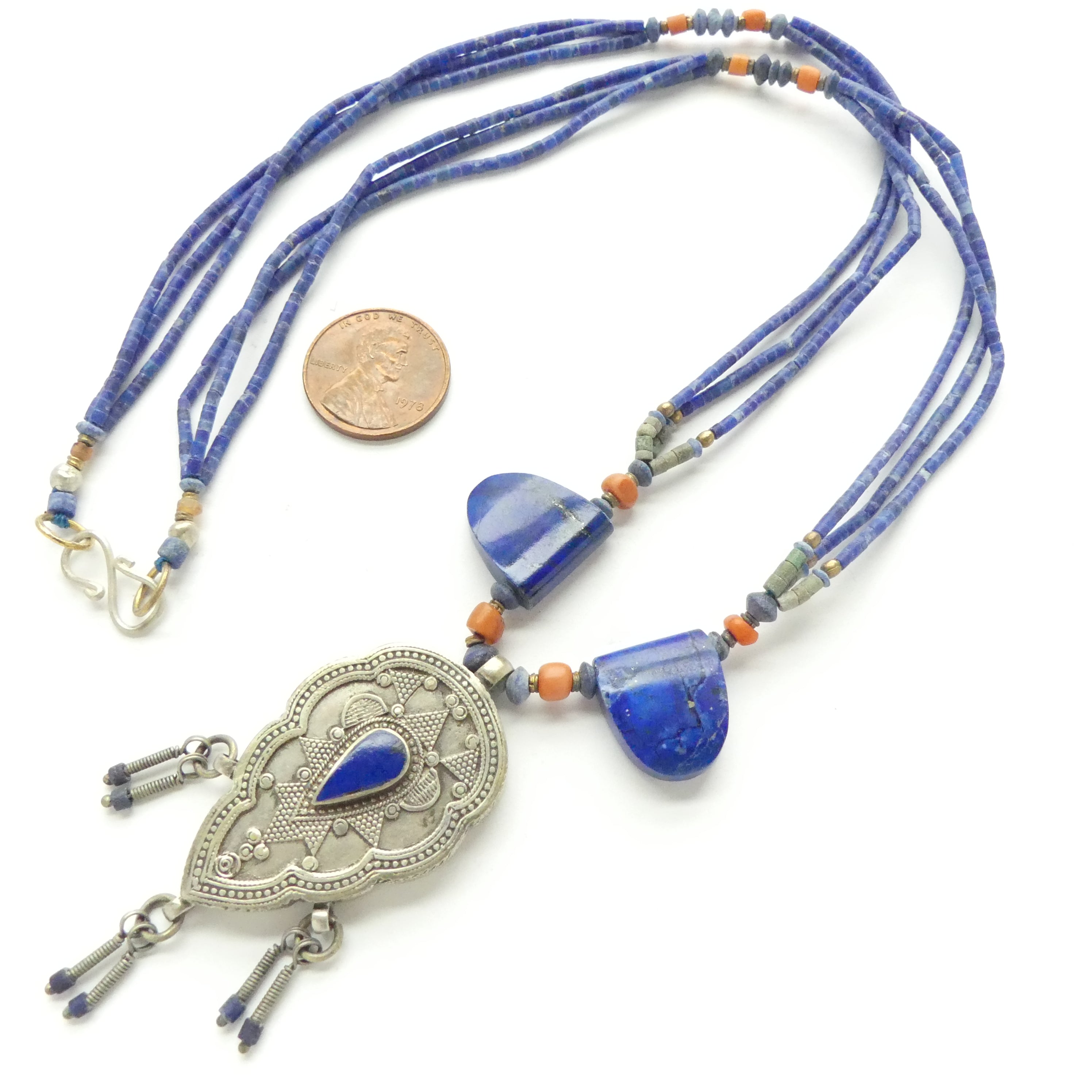 - The vintage pendant (5mm thick) is the centerpiece of this Afghan necklace made of 3 strands of 1mm lapis, accented with coral, a little green serpentine, and two nice tabular natural lapis beads.