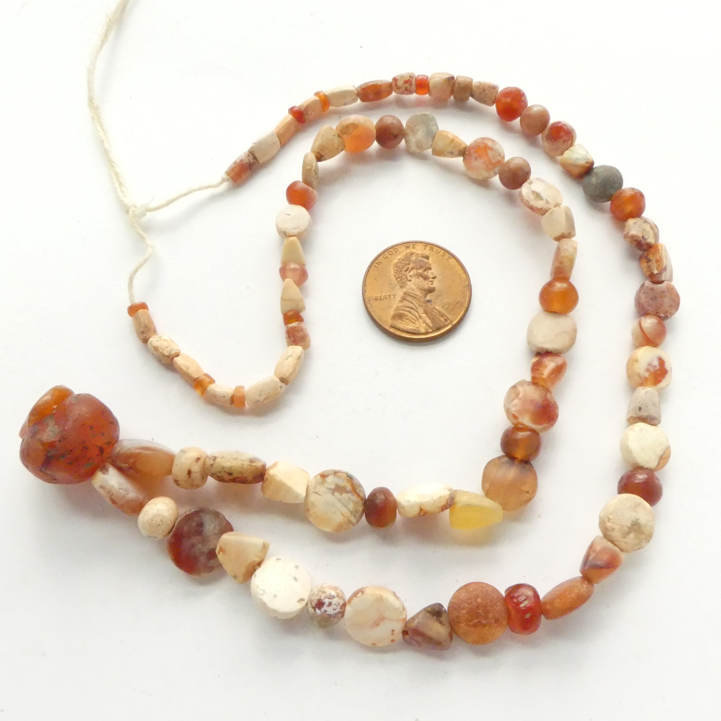 Ancient Carnelian beads, assorted shapes and sizes on 20-inch strand. Mostly coin and unusual 4-sided triangle shapes - 83 beads total - some very tiny.