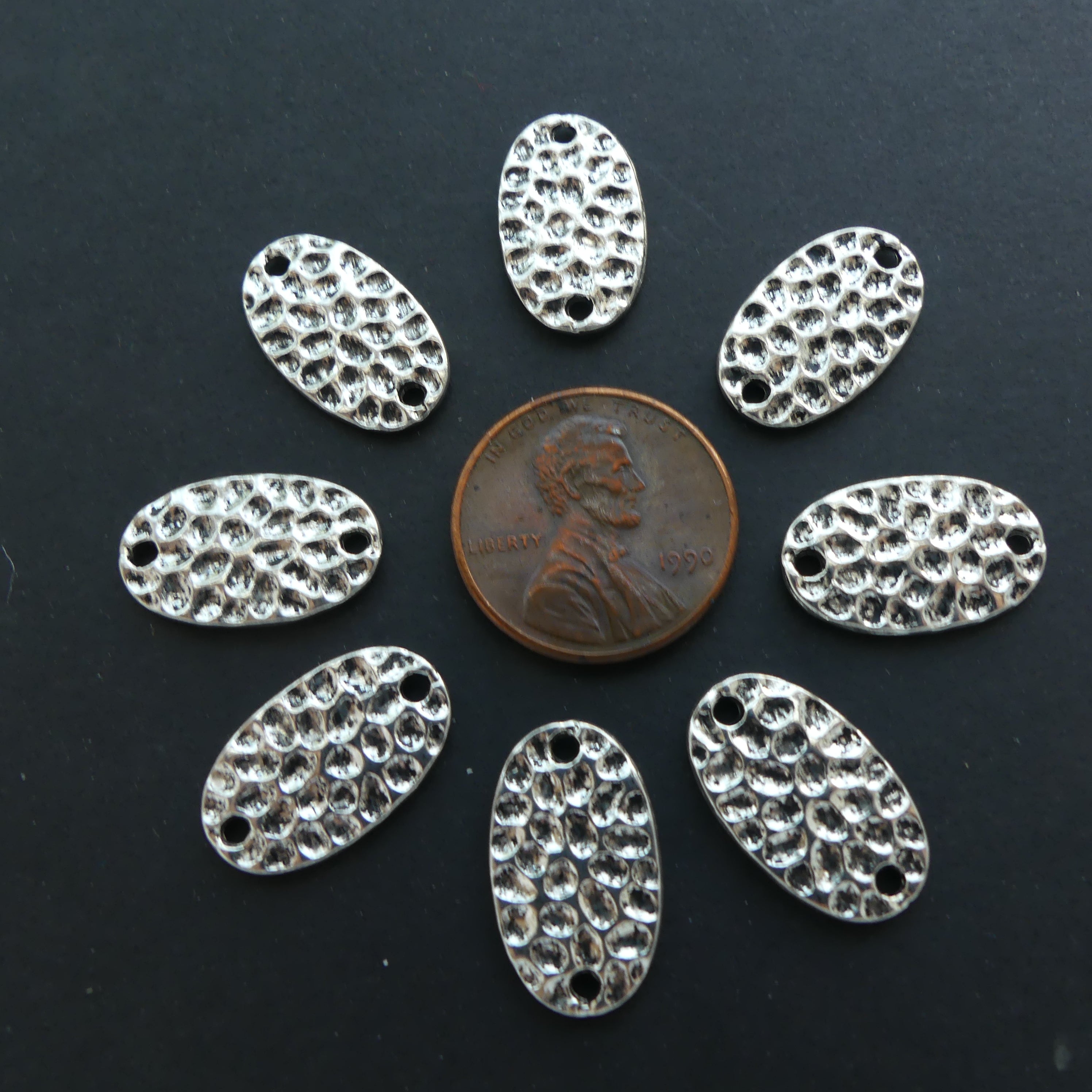 Connector, Cast Silver Tone Hammered Oval Connector w/ Holes at Both Ends, 17mm Long, Sets of 8