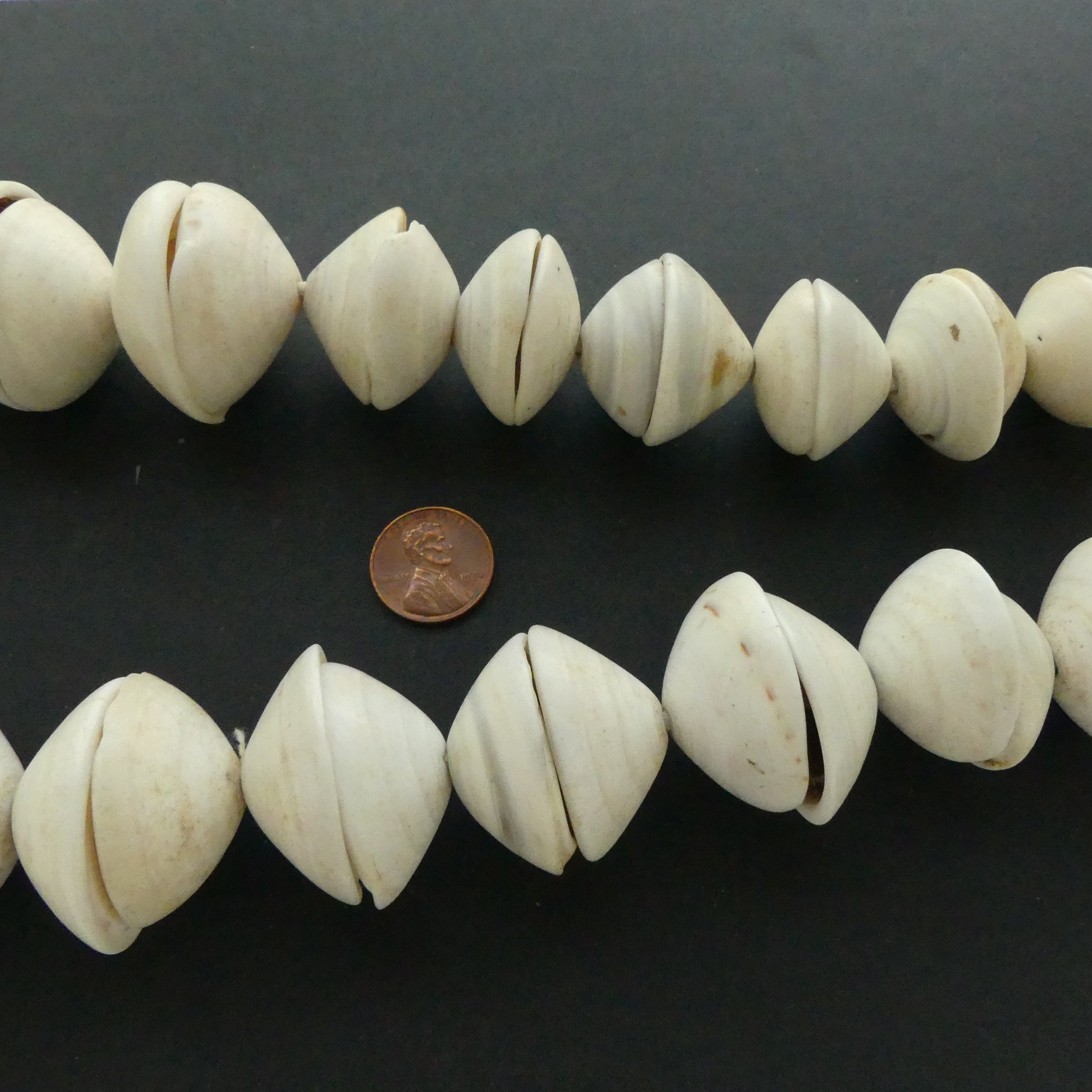 - Enormous, vintage strand of giant conus shell tip pairs, 18-55mm diameter, 40-inch strand, only one broken bead.