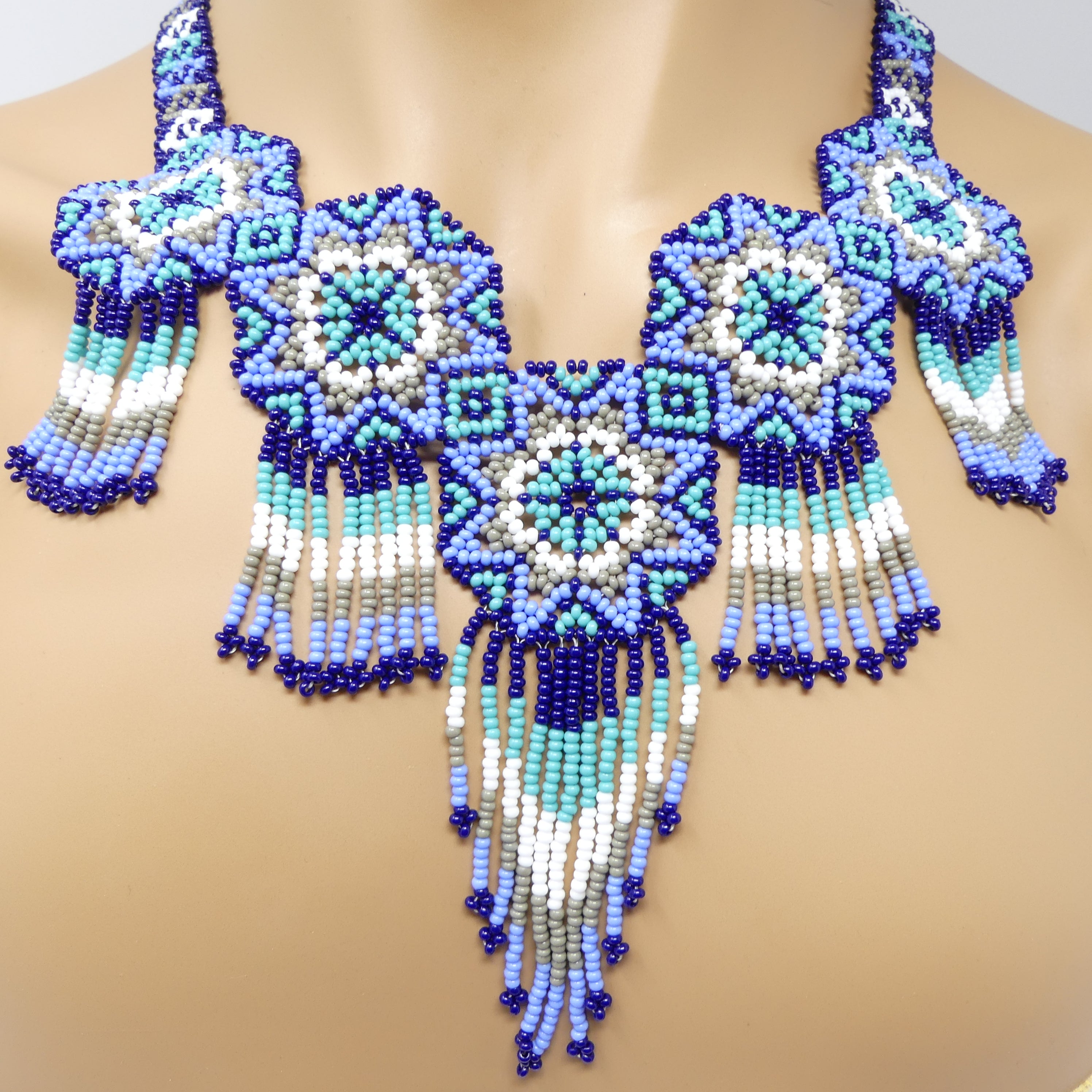 Mandala Necklaces with Fringes, Turquoise, Blue-Grey with White & Black, 22 inches