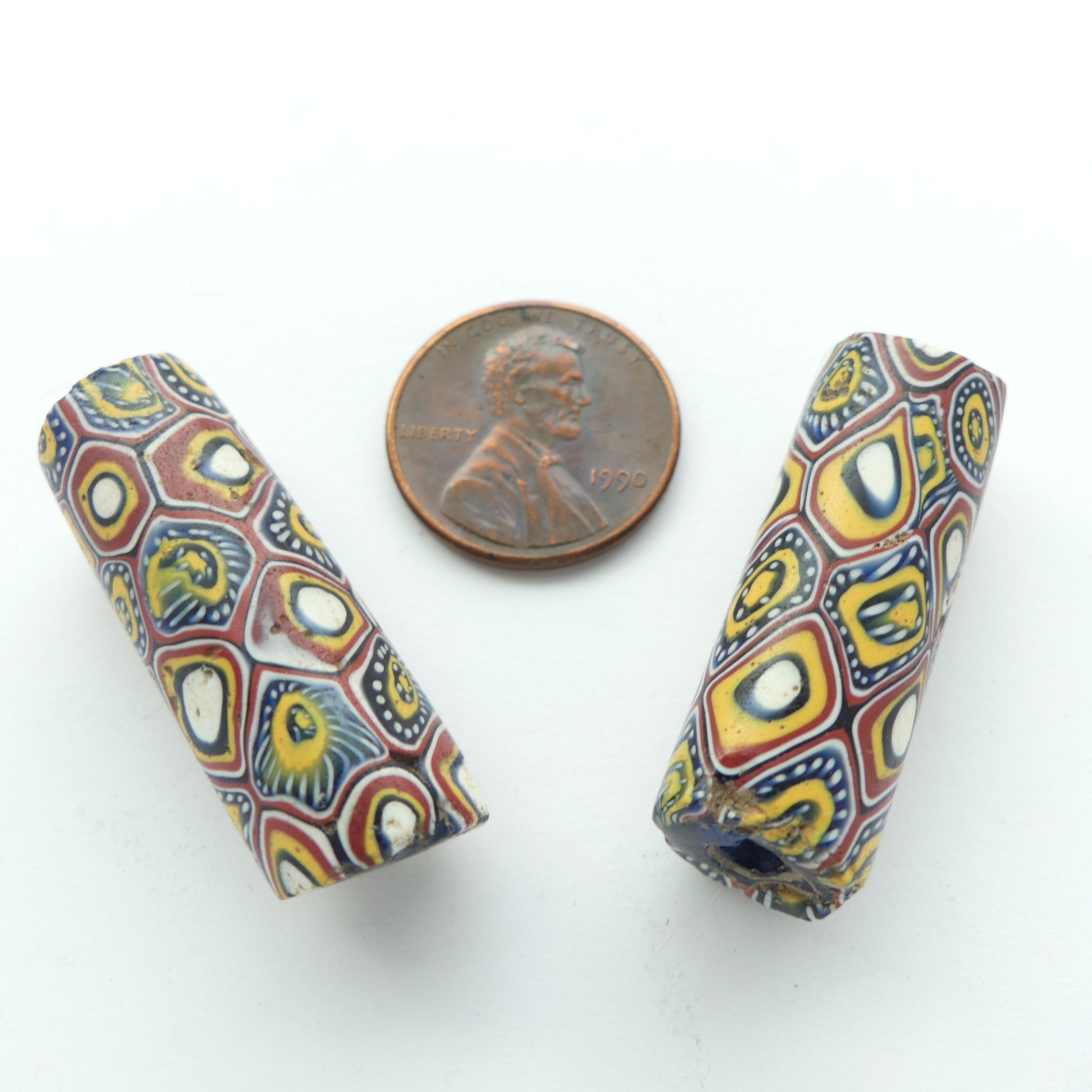 - A beautiful pair of antique Venetian millefiori trade beads each 32x12mm and each sporting two different but complimentary designs. One a complex creation of bundles canes, which however have been completely fused so no rough edges. The second a nicely contrasting simple pattern of concentric circles.
