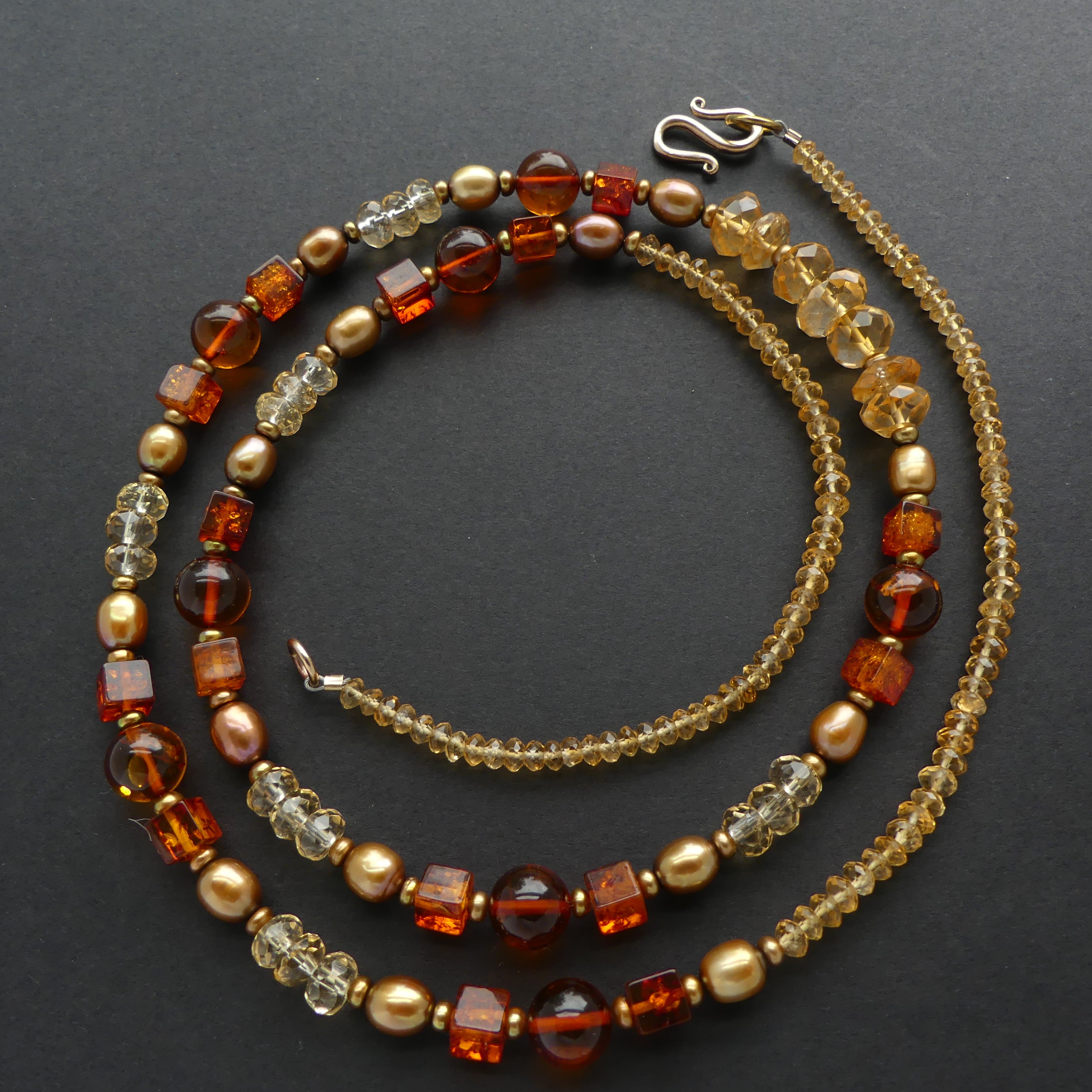 - In this piece I like the contrast of textures, silky pearls and amber beads, with faceted citrine in 3 sizes: 8-10mm, 6mm and 4mm