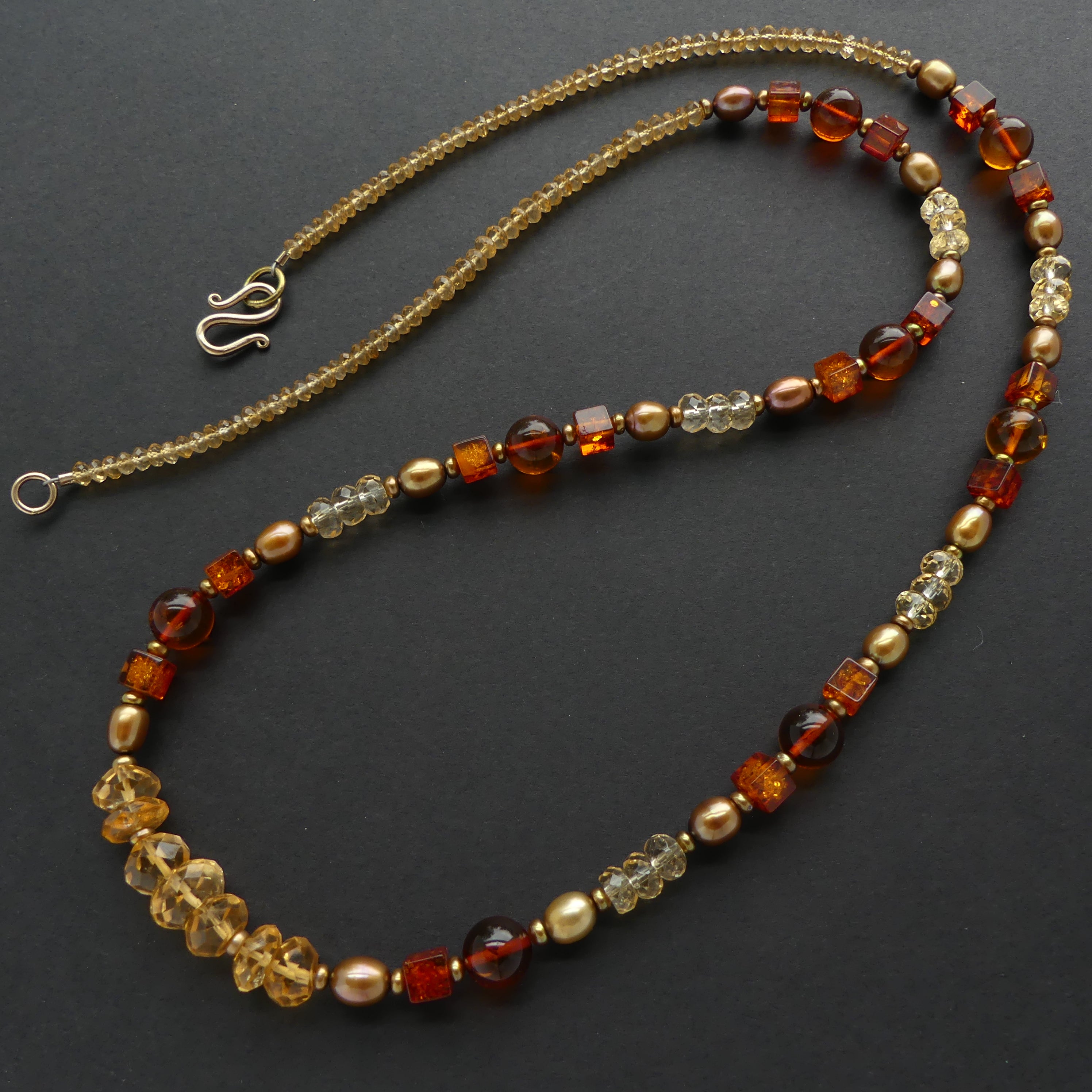 - Necklace of Citrine, Baltic Amber and Bronze Freshwater Pearls 28 inches long