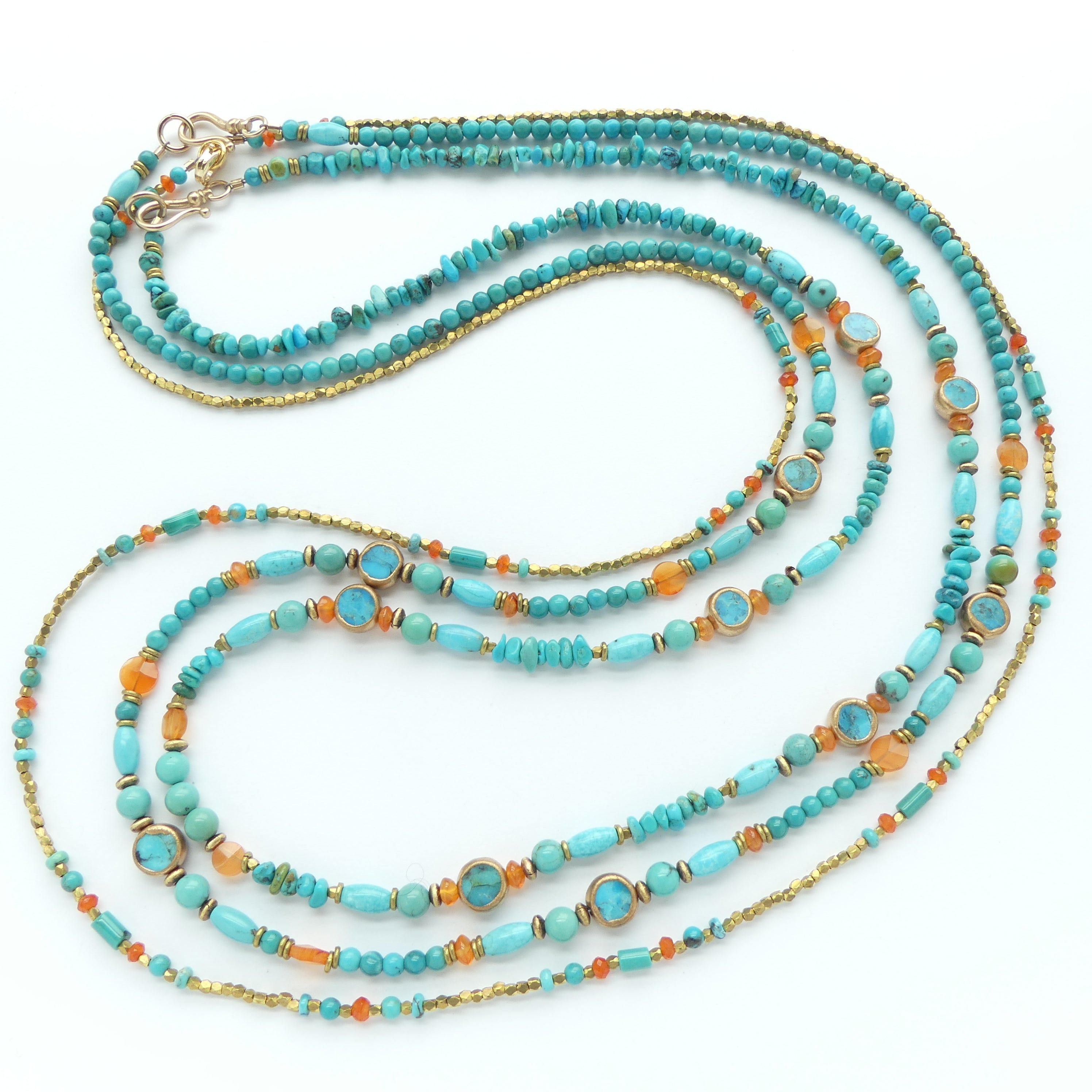 - Framed Turquoise discs are set off by 6mm round and small oval natural Turquoise beads and faceted 6mm carnelian coin shapes and rondelles. Brass heishi spacers and a bronze hook and eye clasp finish it off.