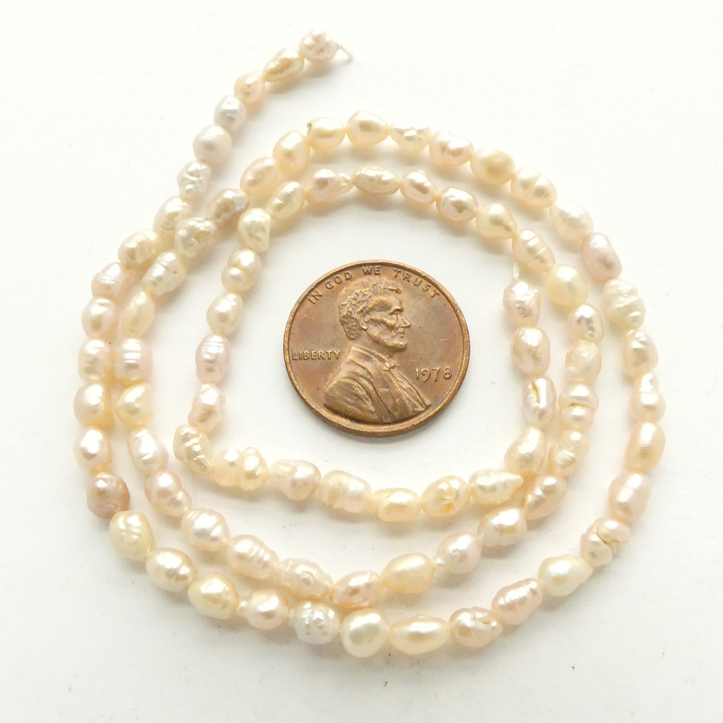 - Pink baroque rice shape pearls about 5x3mm on 16-inch strands