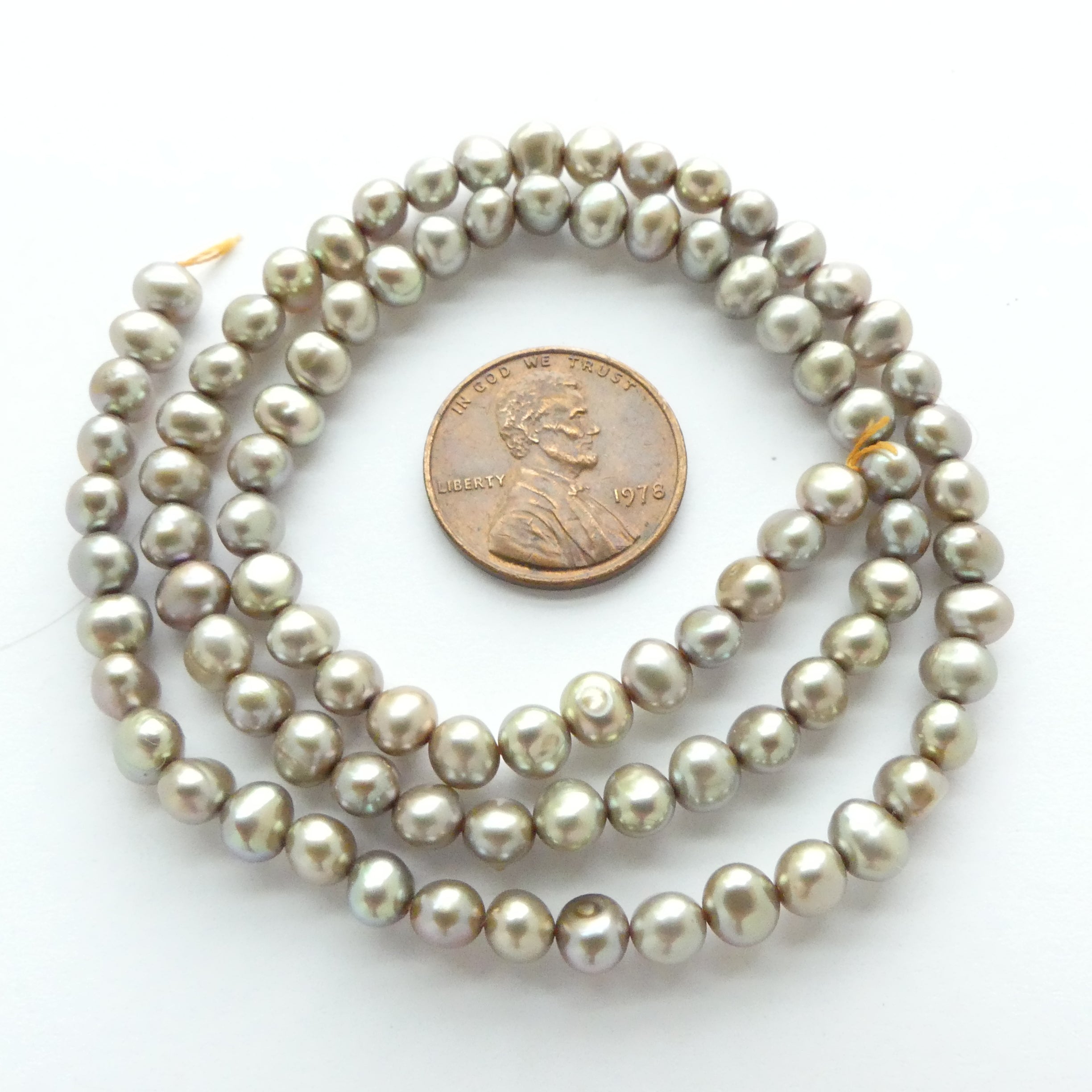 - Silver, almost round pearls, 4mm on 16-inch strands