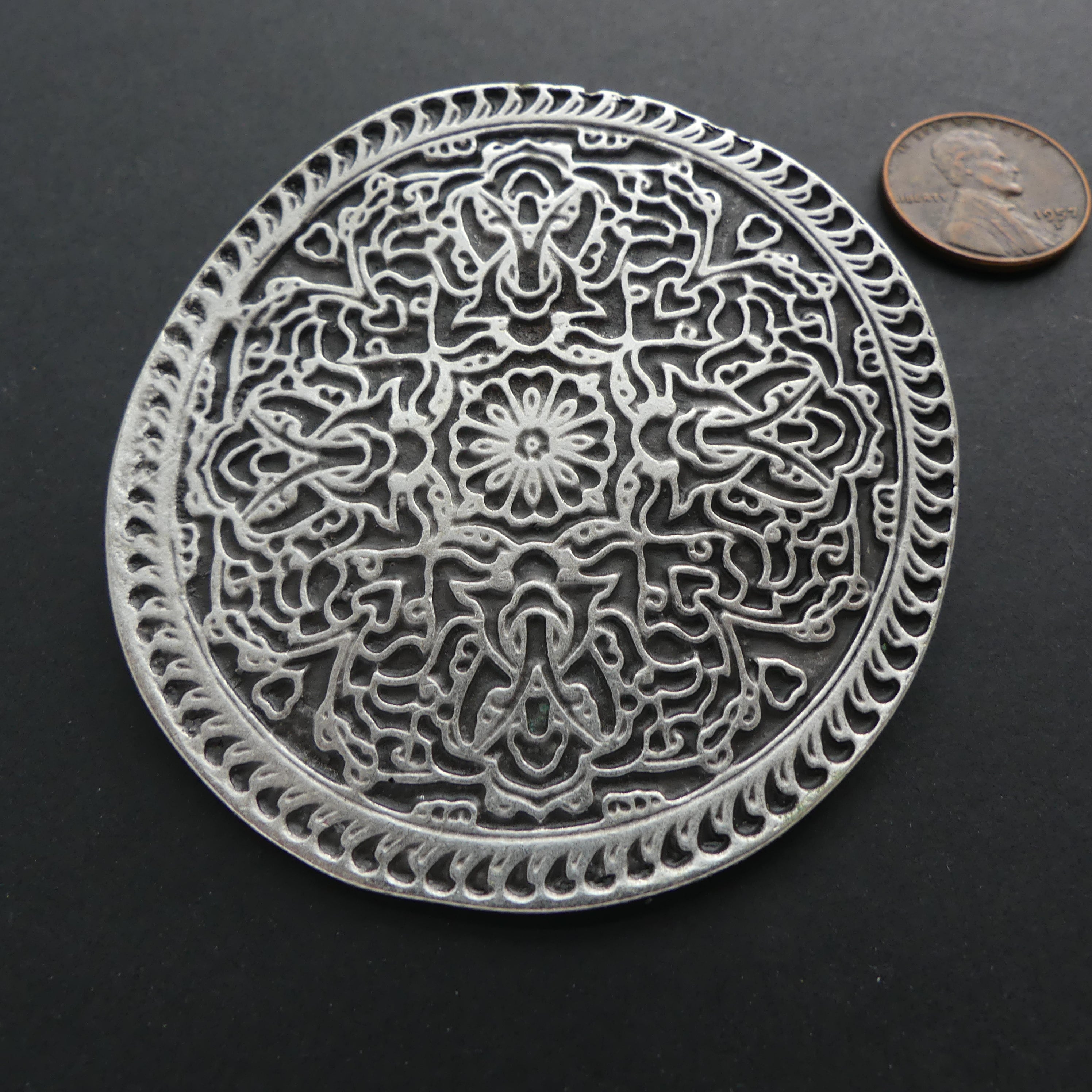 Pendants, Large Turkish White Metal, Round w/ Raised Decoration, Loop on Back, 2.5 inches Diameter