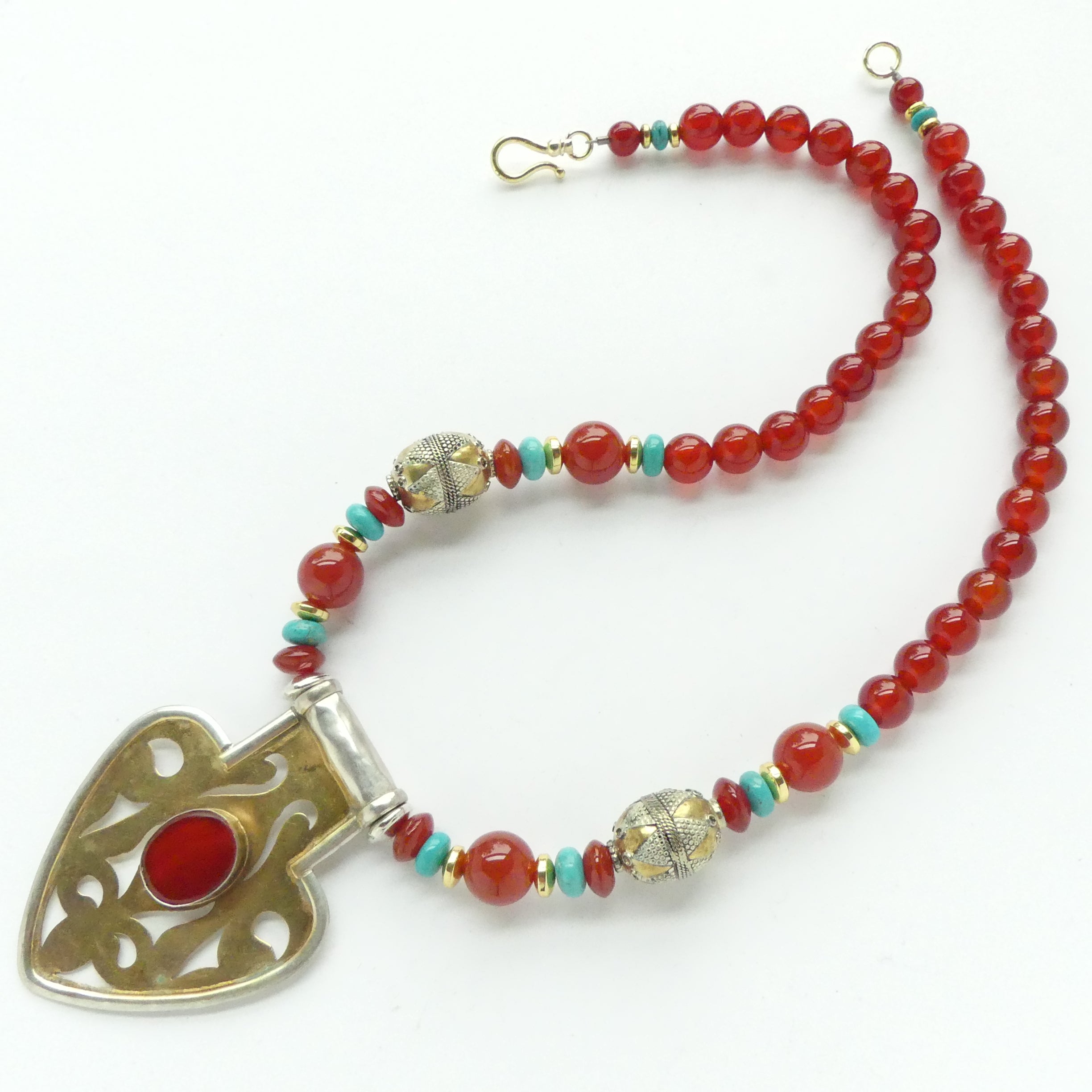 Necklace, Carnelian with Turkoman Heart Pendant, Turquoise & Turkoman Oval Beads, 18 inches long