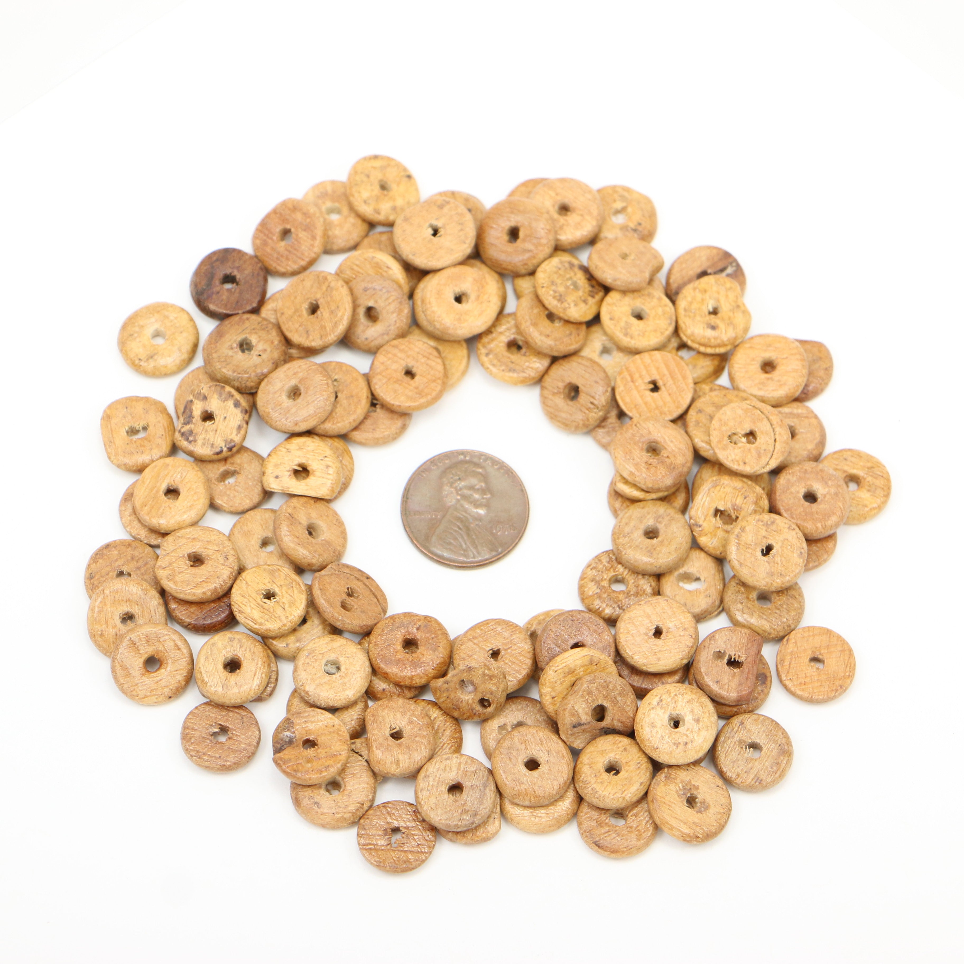 - Light tan color wood discs about 3x11mm. Thickness does vary as these beads are handmade in India. Not every bead is perfect, but at about 2 cents each I'm sure you'll find enough to make the bag worth the price.