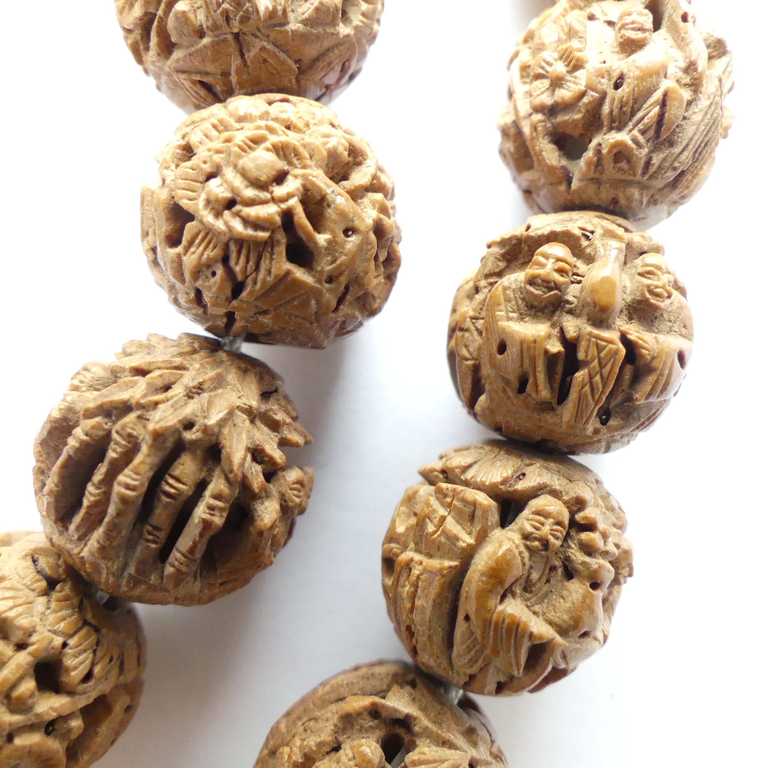 - Vintage Chinese mystery fruit pit carved into 13mm diameter beads with extraordinary detail.